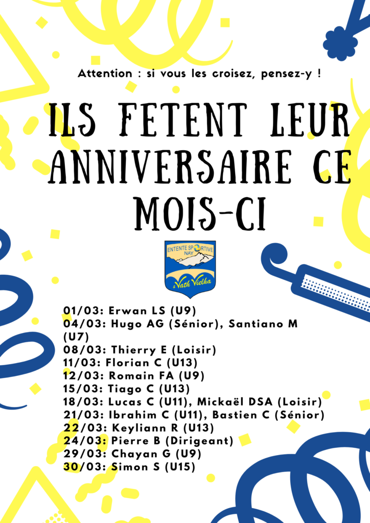 ANNIVERSAIRES MARS 28 Fév 2026Roger GONZATOCLUB0 Ils fêtent leurs anniversaires ce mois-ci, pensez-y si vous les rencontrez ! Vous aimez cet article? Partagez-le avec vos amis.